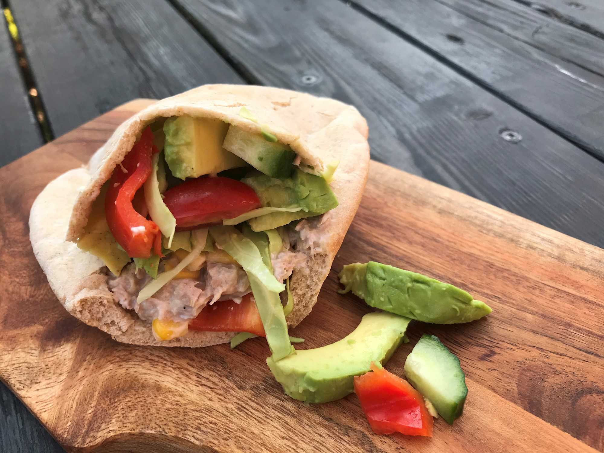 - Fyld pandekagen med bønneblandingen, smuldre laksen og tilsæt kål, avokado, majs og ost.