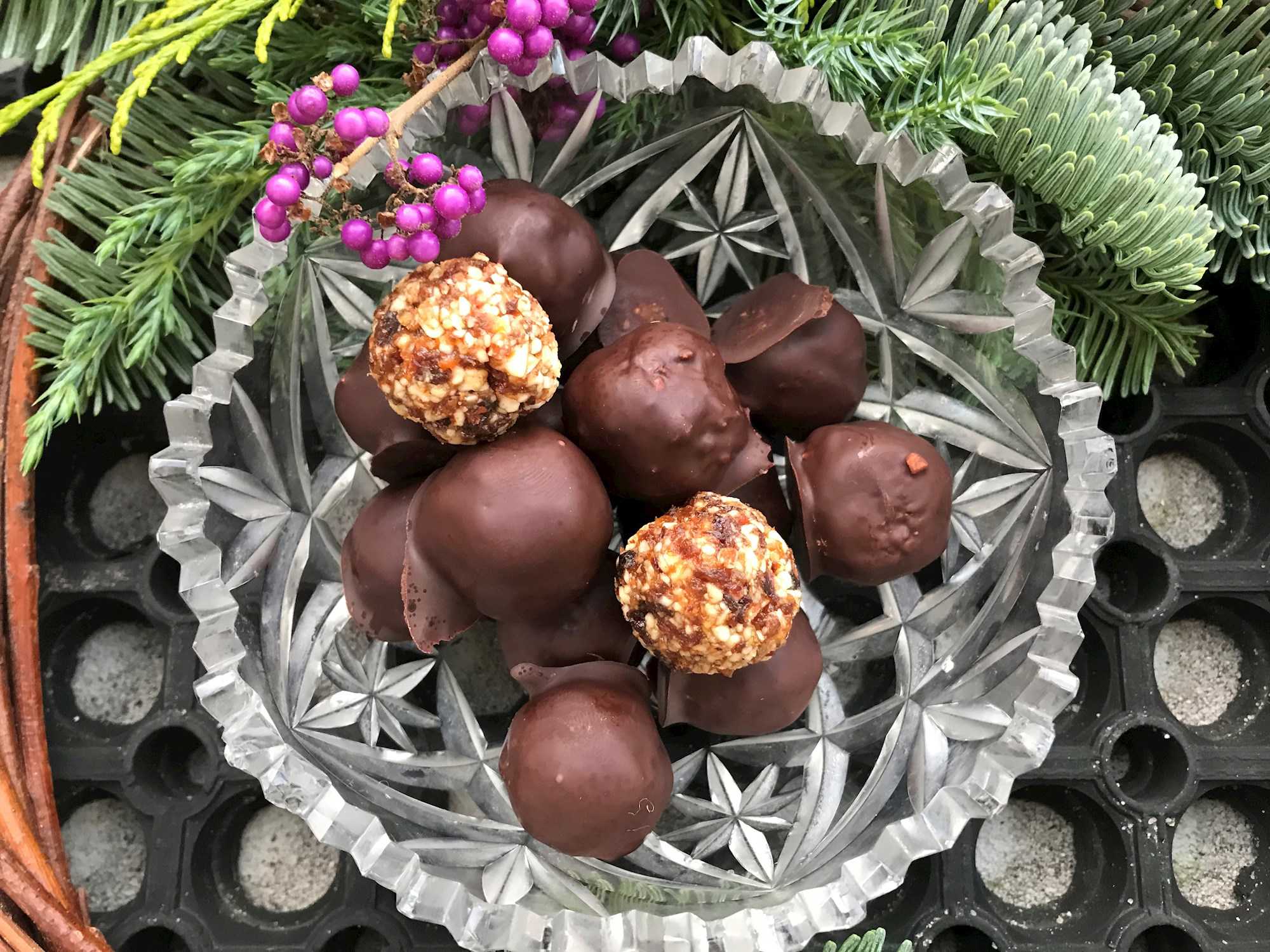 - Hvis du ønsker chokoladeovertræk, så varm chokoladen op i vandbad og overtræk kuglerne med chokolade.
