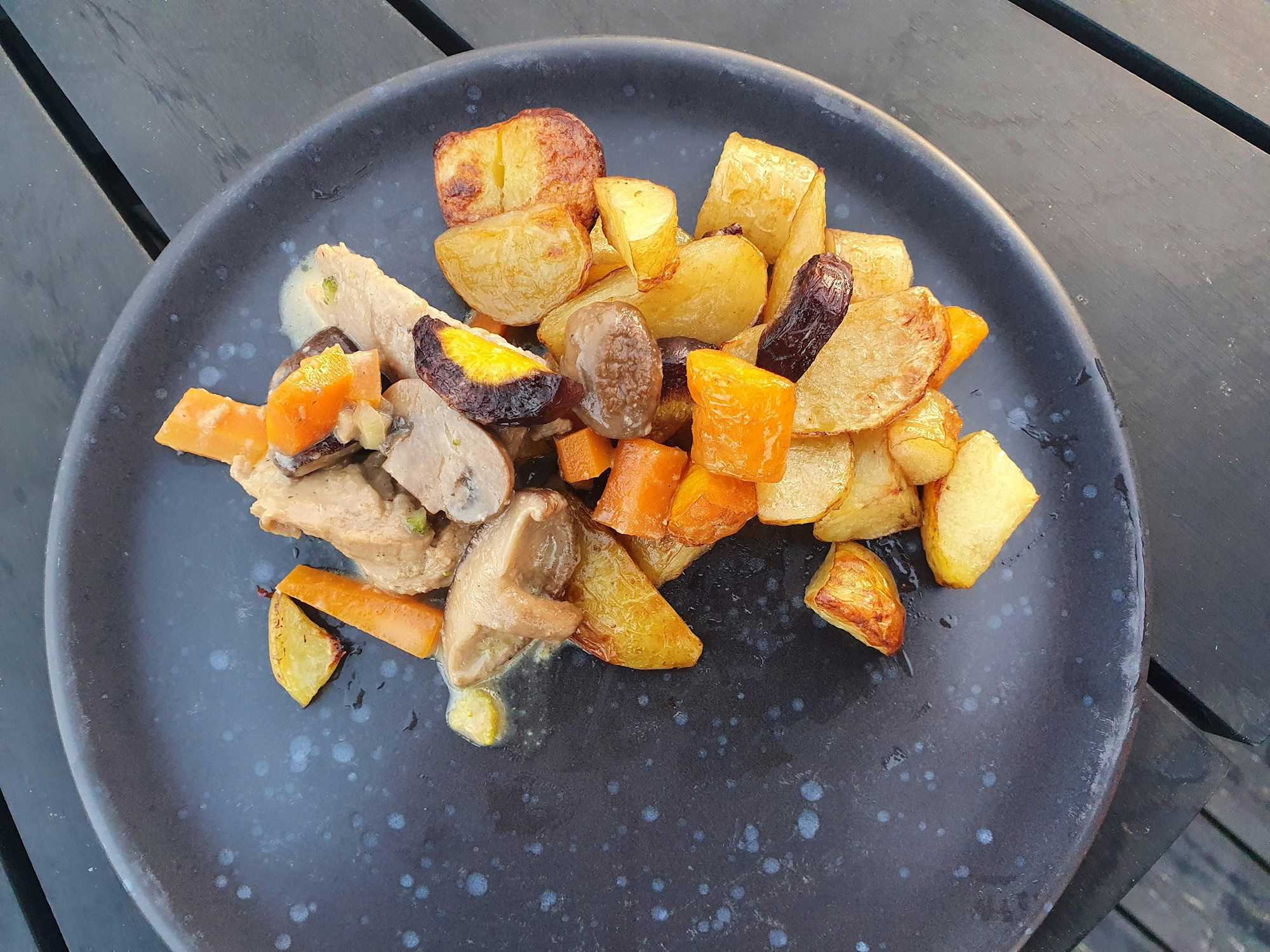 - Skræl kartofler, gulerødder og løg skær dem i grove stykker.