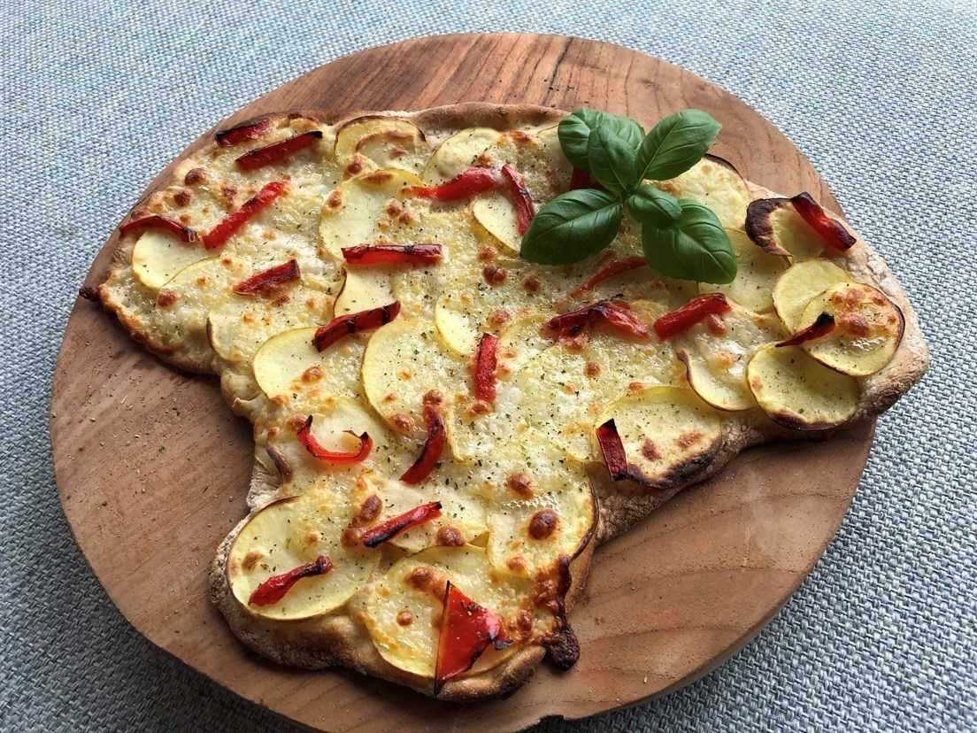Tips. Brug også bagte kartoffelskiver på pizzaen sammen med oliven, løg og cherrytomater.